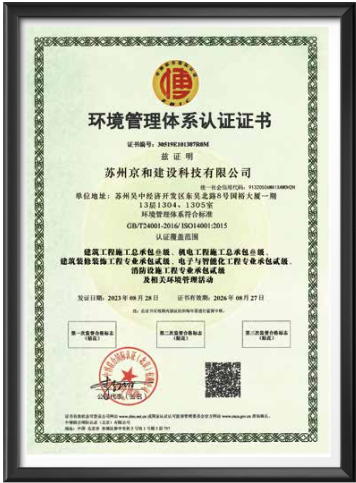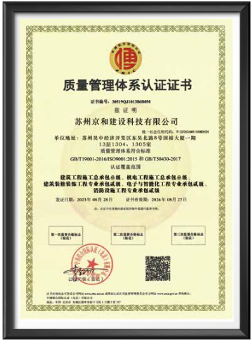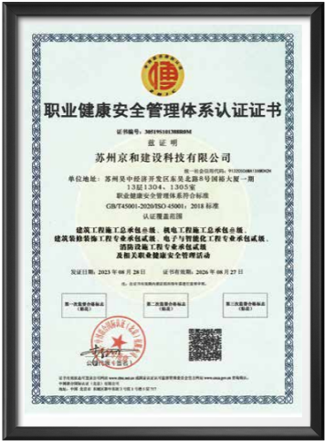 經(jīng)過(guò)多年發(fā)展,京和建設(shè)已成為本行業(yè)技術(shù)領(lǐng)先、實(shí)力突出的優(yōu)勢(shì)品牌,取得建筑工程施工總承包叄級(jí)、機(jī)電工程施工總承包叄級(jí)、建筑裝修裝飾工程專業(yè)承包貳級(jí)、電子與智能化工程專業(yè)承包貳級(jí)、消防設(shè)施工程專業(yè)承包貳級(jí),通過(guò)了 ISO9001、T50430 質(zhì)量管理體系認(rèn)證、環(huán)境管理體系認(rèn)證、職業(yè)健康安全管理體系認(rèn)證。