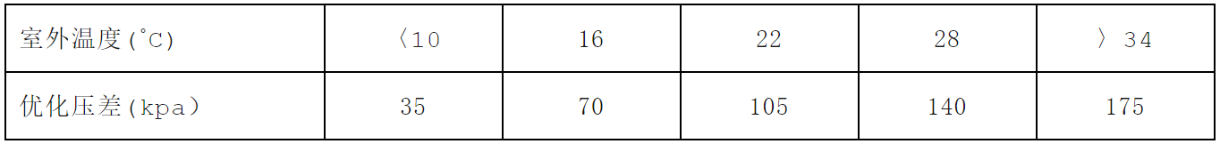 6)冷凍水泵的電機由變頻器控制,使冷凍水系統(tǒng)供回水壓差滿足空調(diào)負荷變化的需要。優(yōu)化前根據(jù)冷凍水流量供回水壓差設(shè)在100kpa~370kpa,偏高;優(yōu)化后的供回水壓差則是根據(jù)室外溫度設(shè)在35kpa~175kpa,見表2。由于供回水壓差降低了,節(jié)約了水泵電機用電量。